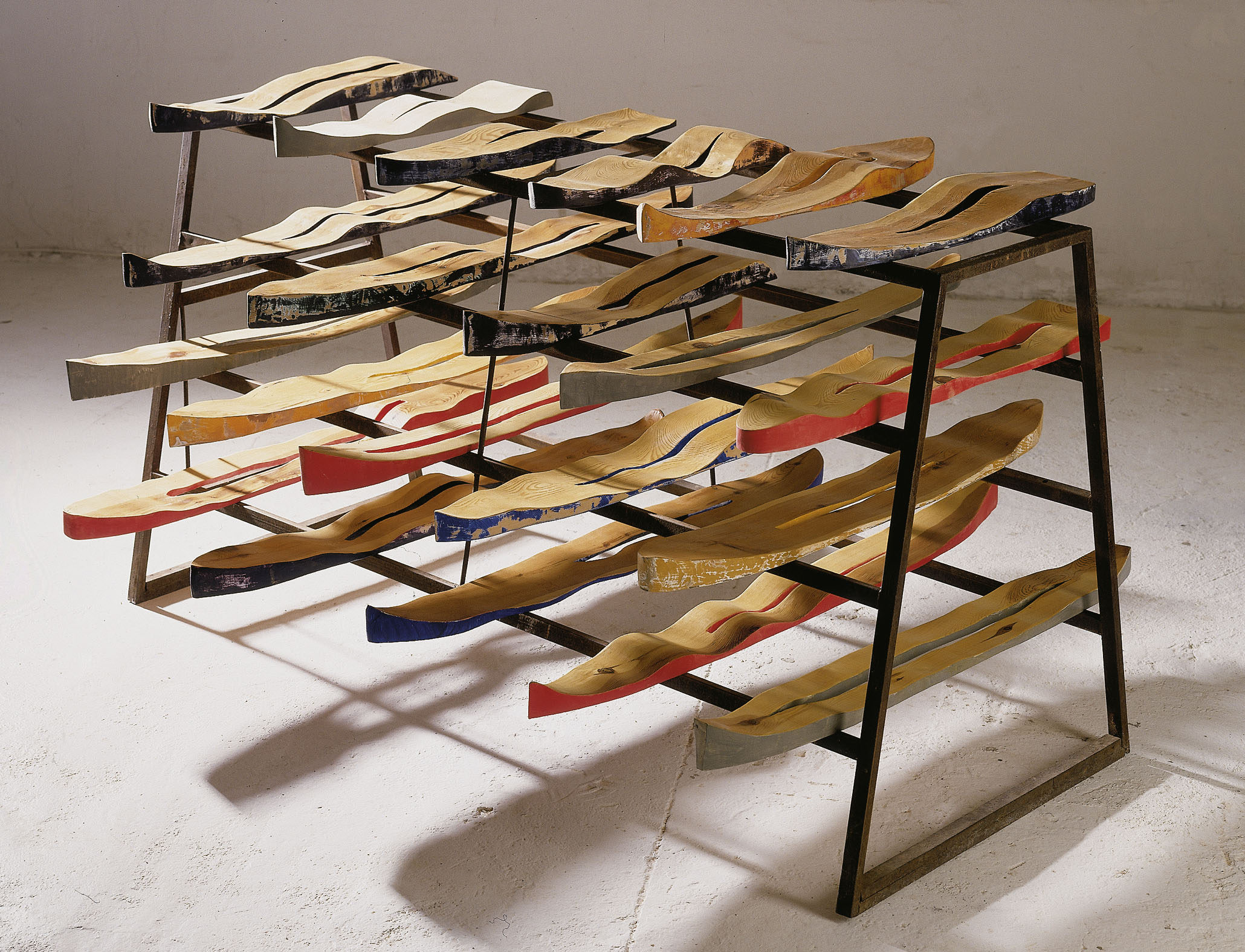El caso es que esos caminos, sus accidentes, sus señales, los paisajes sorprendentes con que se encuentra el caminante o el efecto de esos paisajes en la memoria, todo eso está en estas esculturas marcadas con los azules y los ocres de la tierra y el cielo, en estas pinturas que se alargan vertical u horizontalmente para dar lugar a un trayecto. (...)